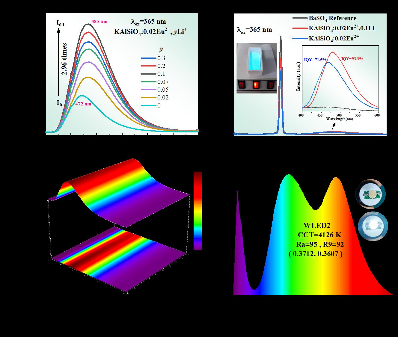 (a)KAlSiO4:0.02Eu2+,yLi+荧光粉的发射光谱;(b)两个代表样品的量子产率;(c)KAlSiO4:0.02Eu2+,0.1Li+荧光粉的变温光谱;(d)使用代表样品制备的WLED器件的EL光谱图