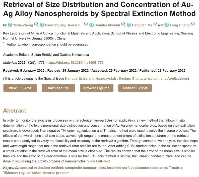 beat365正版唯一官方网站由帕尔哈提江·吐尔孙教授带领的电磁场理论及应用研究团队,在国际期刊《Materials》(JCR 1区,IF: 3.623)发表了题为“Retrieval of Size Distribution and Concentration of Au-Ag Alloy Nanospheroids by Spectral Extinction Method”的研究论文。通讯作者为帕尔哈提江·吐尔孙教授,2019级硕士研究生郑玉霞为第一作者,beat365正版唯一官方网站为第一完成单位,该论文的发表是推进beat365官网电磁场理论及应用研究团队建设的重要体现。