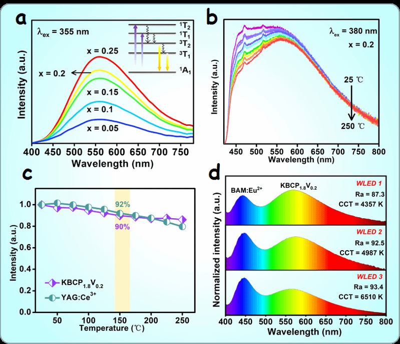阴离子基团VO4具有优异发光特性,是实现高显色性照明器件极具潜力的激活剂材料。然而局限于VO4基荧光材料的种类和数量,研究者们未能开发出达到商用标准的高热稳定性VO4基荧光材料。戴鹏鹏教授带领的创新团队提出在高热稳定性的K2BaCa(PO4)2中构建VO4发光中心的新思路,获得了具有高热稳定性的超宽黄色荧光材料K2BaCa(PO4)2-x(VO4)x,荧光粉在温度为150℃时保持90%荧光强度(图1a-c)。该团队利用获得的荧光粉制作了具有高显色性(Ra=87.3-93.4)和宽范围色温(CCT=4357-6150 K)的白光LED器件(图1d)。该研究工作可能会引起研究者们对阴离子基团激活剂的关注,并加速先进的VO4基荧光粉的发展。