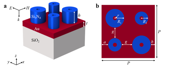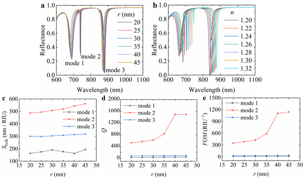 本论文以混合空心圆柱四聚体阵列(图1所示)为研究对象,采用时域有限差分(FDTD)方法揭示了该阵列的折射率传感特性(图2所示)随空心圆柱孔径半径、氮化硅层高度、入射角和偏振角等参数的变化规律和物理机理。同时在特定边界条件和模拟环境参数下展开研究,依据科学严谨的公式对折射率灵敏度、Q因子和品质因子等关键性能指标进行计算,为实现高性能传感器件提供一种可能。