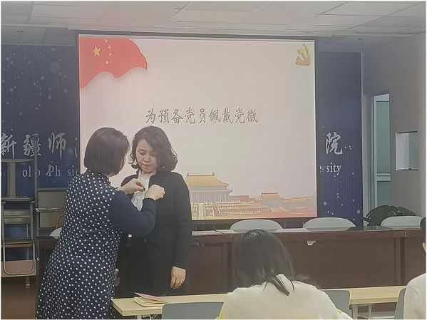 在党旗下,支部书记王静为预备党员阿斯亚同志佩戴了党员党徽,进行了庄严的入党宣誓,全体党员重温了入党誓词。通过宣誓和重温誓词,党员们再次坚定了共产主义信仰,表达了为党和人民事业奋斗终身的决心。