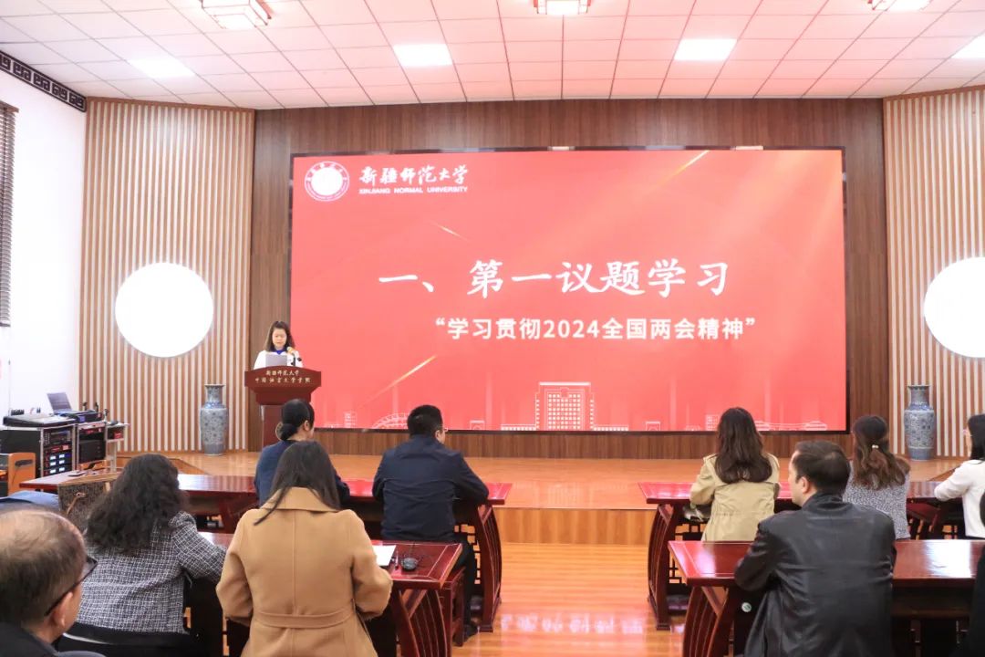 为深入学习贯彻全国两会精神,准确把握两会精神实质,把思想和行动统一到党和国家的决策部署上,进一步激发党支部组织活力,切实提高党支部的凝聚力和战斗力,3月29日,beat365正版唯一官方网站教师第一党支部联合中国语言文学学院教师党支部在温泉校区文科四号楼国学讲堂开展“学习两会精神 凝聚奋进力量”主题党日活动。活动由中国语言文学学院党委组织员何丹主持,中国语言文学学院党委书记陈国栋、beat365正版唯一官方网站党委书记李莉及两学院教师党员参加活动。