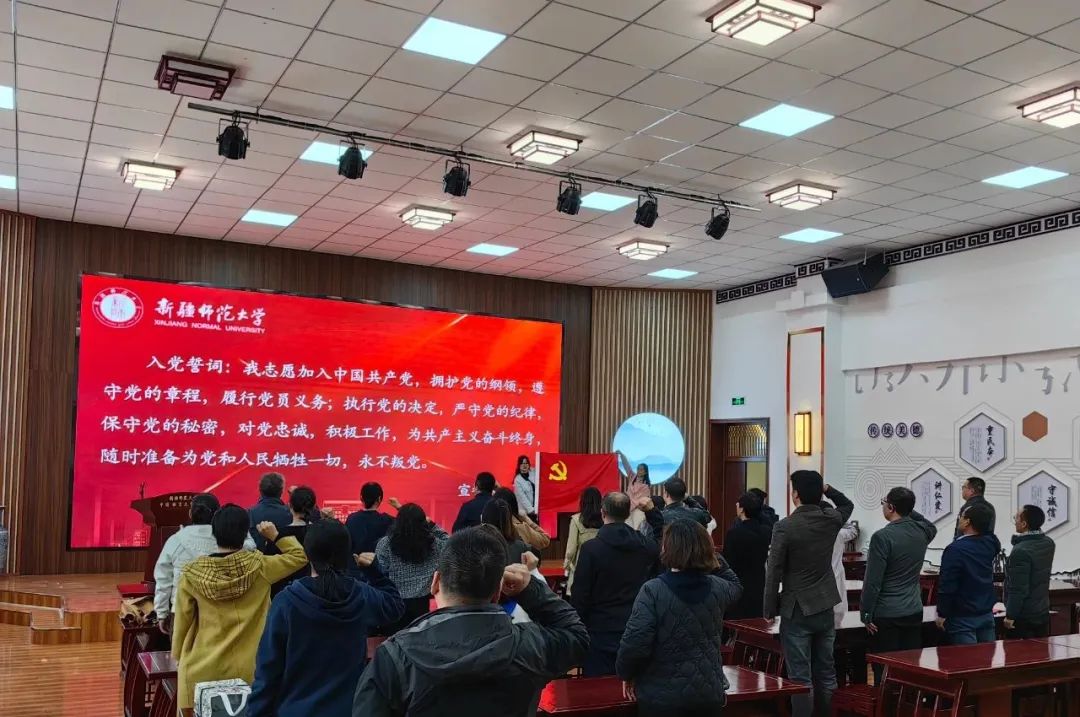 分享交流后,在中国语言文学学院党委书记陈国栋同志带领下,全体党员面向党旗重温入党誓词。铿锵有力的80字入党誓词,再一次警醒党员同志奋勇拼搏、砥砺前行。接着,两学院的四位教师党员代表接力诵读了《中国共产党章程》第三十条到第三十四条。