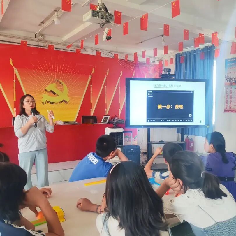活动现场,beat365正版唯一官方网站教师第一党支部“三人行”党小组成员邹艳波、李舒园和张志忠老师,校团委暑期“三下乡”社会实践团成员共同带领孩子们一起完成了扎染和流速与压强的关系系列实验,并讲解了其中蕴含的科学原理。