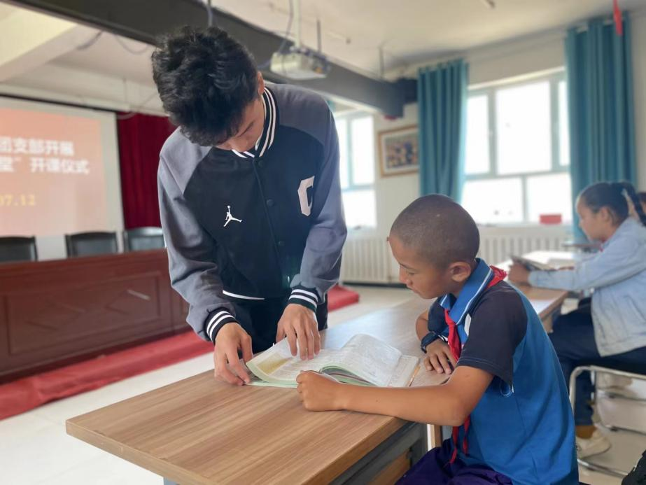 哈斯尔别克·热合曼同学辅导小朋友学习