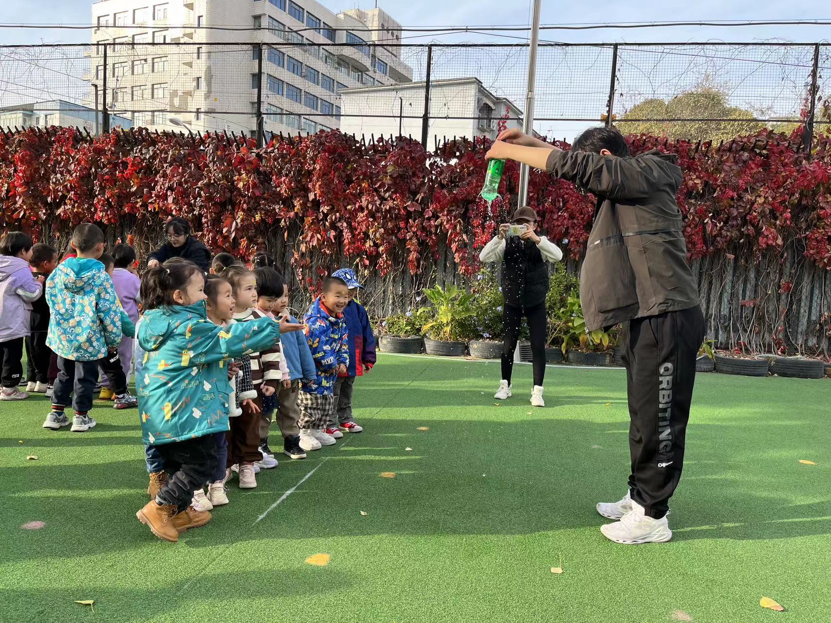 儿童是天生的科学家,他们有着无穷无尽的好奇。在“旋转喷泉”的环节中,寻找一个废弃的塑料瓶,清洗干净,并用大头针扎洞,然后在瓶子中倒入水,并迅速拧上瓶盖,通过开关瓶盖控制喷泉。装满水并拧紧瓶盖,由于瓶子内部与外面空气隔绝,所以在外界大气压作用下,几个洞并不会向外喷水。松开瓶盖后,外部气体进入瓶子中,使瓶子内外大气压相同,由于液体受到重力作用,另外液体压强随深度增加而增加,所以水就会从洞中喷出了。虽然物理原理艰涩难懂,但我们使用浅显易懂的言语让孩子们在活动中感受大气压强,理解大气压强。