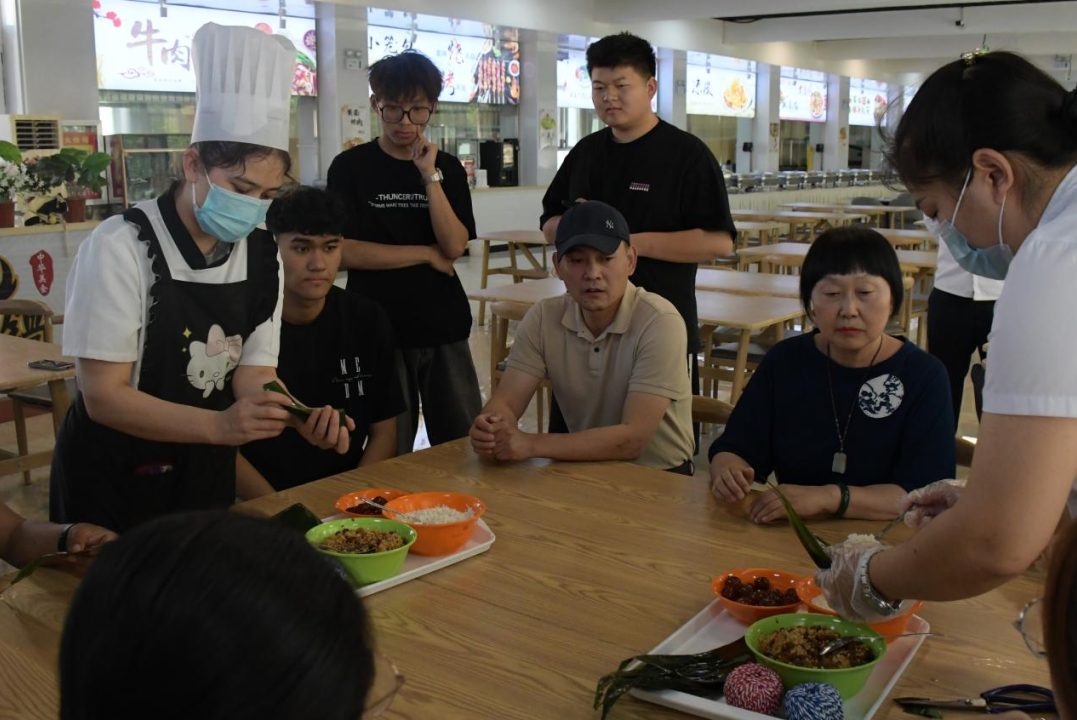 6月7日,端午佳节临近,为了弘扬中华民族传统文化,增进师生间的感情,共同体验传统节日的魅力,学院组织开展“粽”享幸福、浓情端午活动,邀请“三进两联一交友”教师及部分学生参加包粽子活动。巧手学包粽,浓情迎端午,食堂工作人员为师生们详细讲解演示了包粽子的方法要领,一折叶、二盛料、三压实、四包严、五扎绳,老师和同学们开始了“新手上路”包粽子,只见大家的手指穿梭在粽叶、棉丝之间,青绿的粽叶、洁白的糯米在大家手中瞬间便“变成”了一个个有棱有角的粽子,虽然粽子的形态各异,包法也不尽相同,但不变的是老师和同学们对端午节文化的传承。