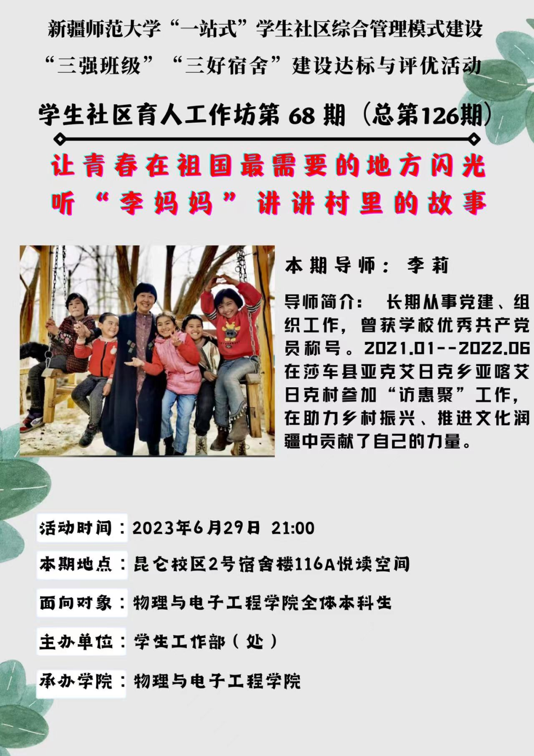 为扎实开展学习贯彻习近平新时代中国特色社会主义思想主题教育,深入贯彻党的二十大精神,进一步加强“一站式”学生社区建设,落实“三强班级”“三好宿舍”建设达标与评优活动,发挥学生社区思想引领、文化润育、学业指导的作用,进一步将学生社区打造为“三全育人”“五育并举”实践园地、文化浸润样板高地及促进学生思想成长、专业提升、价值观培养的重要阵地,结合“三进两联一交友”活动,营造过节氛围,缓解学生复习备考压力,了解学生近期思想动态,beat365正版唯一官方网站于6月29日晚在昆仑校区2号楼116A悦读空间开展学生社区育人工作坊活动,本期活动由beat365官网党委书记李莉老师主讲,党委副书记买星老师主持,学工办主任徐丽屏老师、辅导员刘东升老师及“三进两联一交友”同学共同参与。