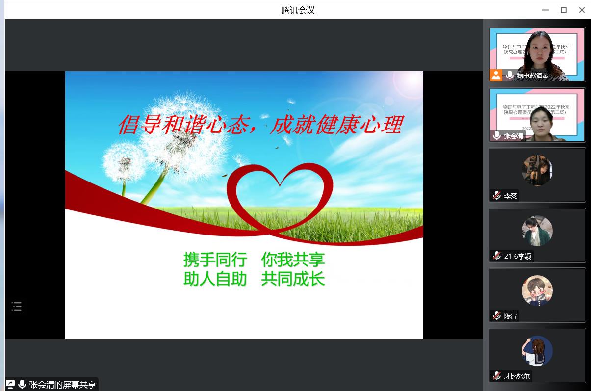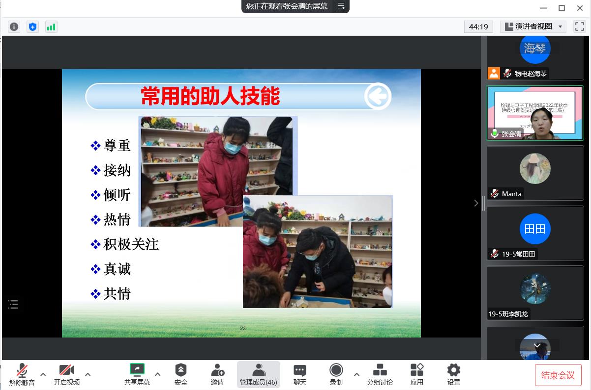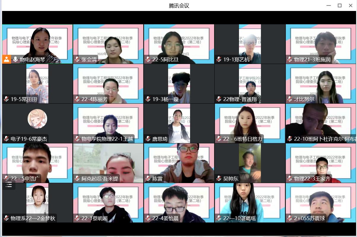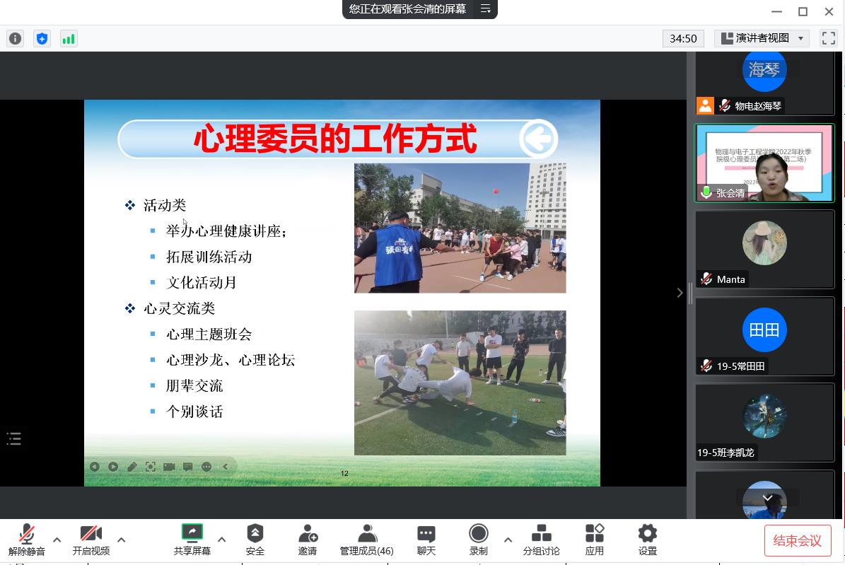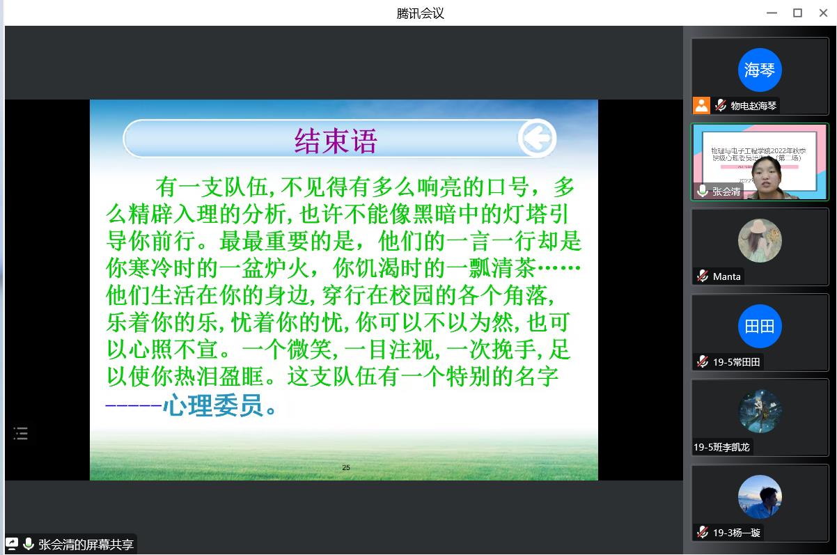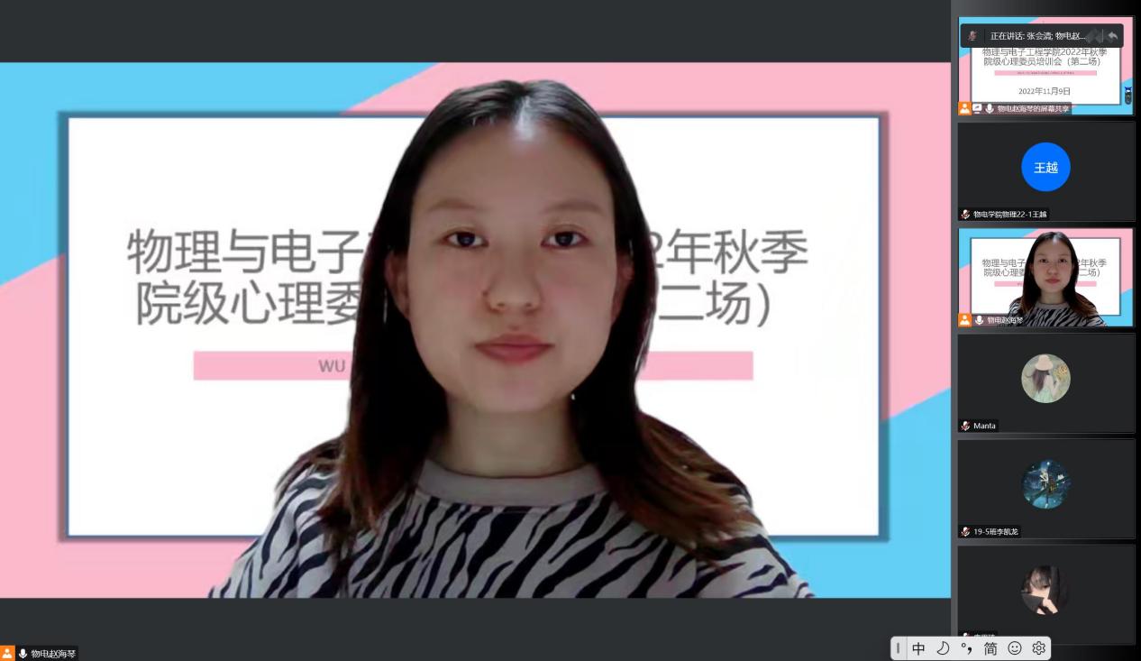 班级心理委员是学校心理健康教育工作的重要组成部分,在beat365官网心理健康教育工作中发挥着重要作用。为进一步提升beat365官网心理委员在心理健康教育工作中的积极影响,beat365官网于11月10日晚20:00在腾讯会议线上开展了第二场2022年秋季院级心理委员培训会。本次培训邀请到了beat365官网物理20-3班张会清(原学生会心悦部负责人)作为主讲人做培训,学院全体心理委员参加。