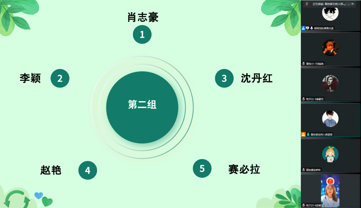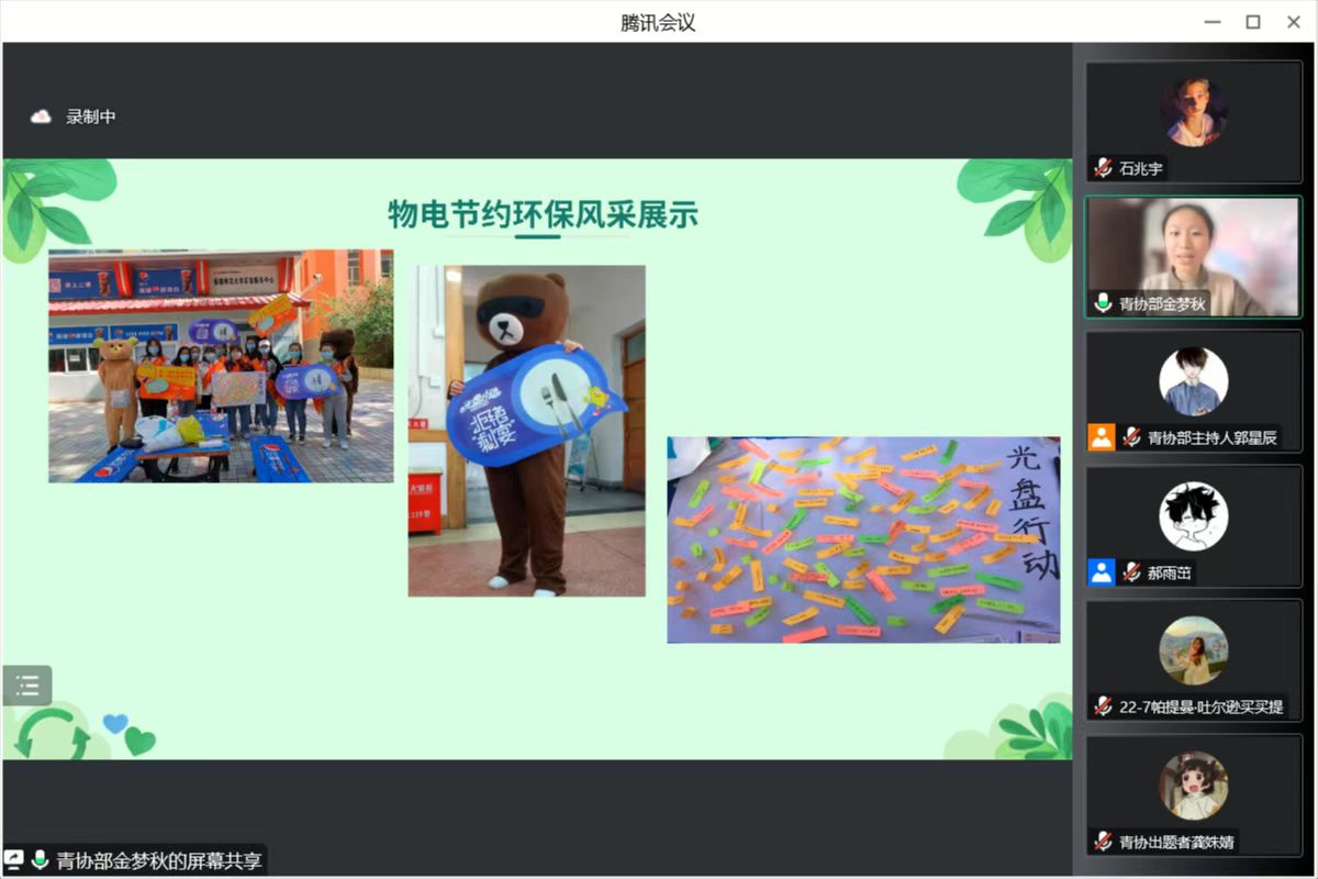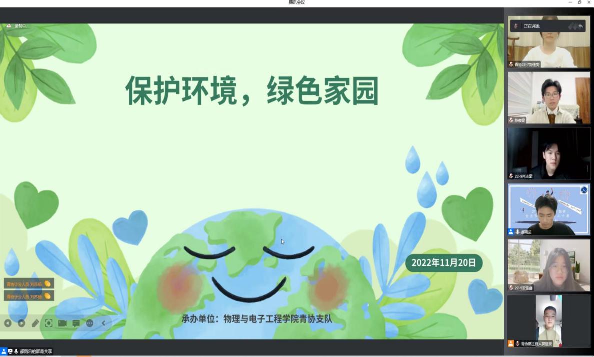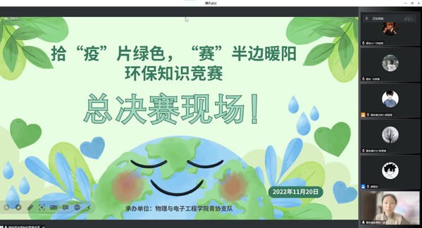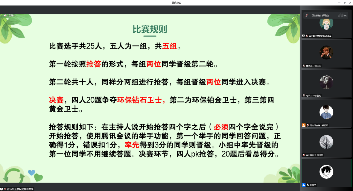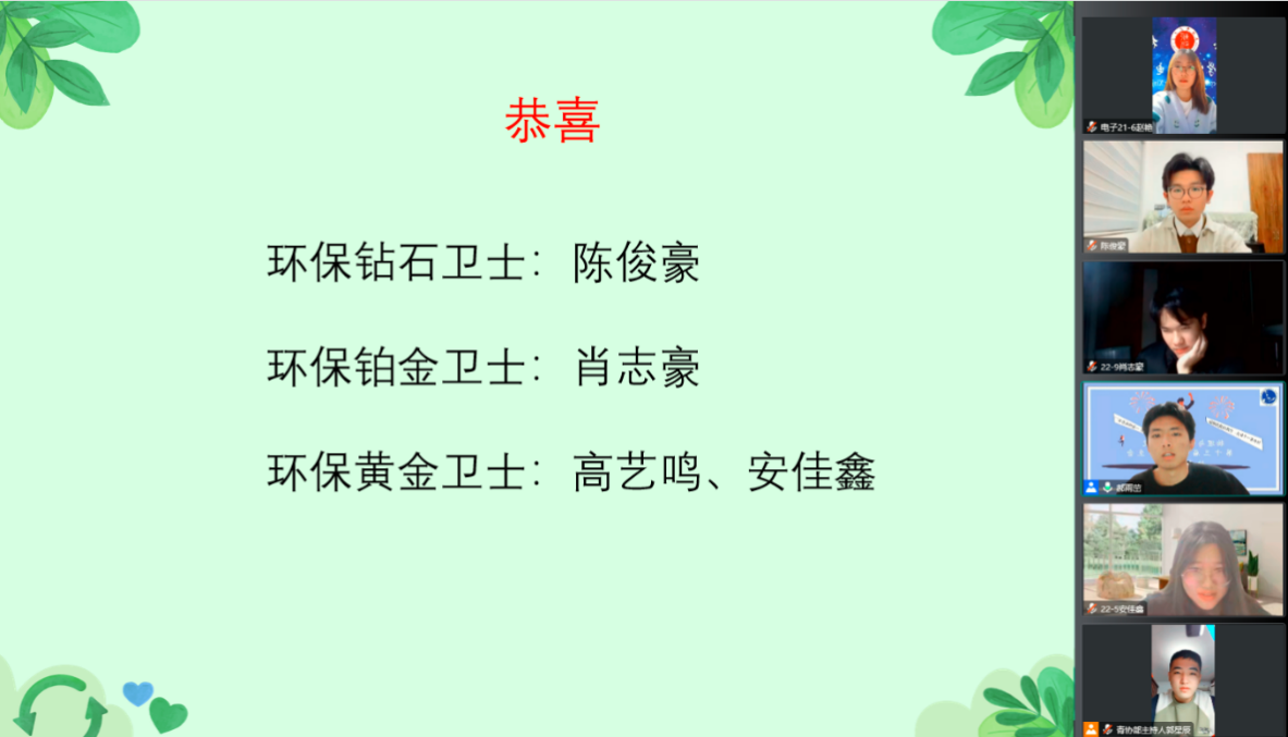 比赛由初赛和决赛组成,均采用了线上答题的方式进行。11月19日举办的初赛为考试模式,取成绩前20%的同学进入决赛。11月20日下午17:00决赛正式开始!首先,青协支队预备成员金梦秋向全体参赛人员展示了物电学院节约环保的部分活动风采。其次,青协支队队长郝雨茁为大家介绍了本次知识竞赛的规则和注意事项。决赛为抢答模式,经过三轮激烈的角逐,陈俊豪、肖志豪、高艺鸣、安佳鑫同学成功晋级总决赛。比赛中,4位同学争先恐后,各分春秋,其中陈俊豪同学以多答对1道题的优势夺下了环保钻石卫士的奖项,其余3位同学分别或得了环保铂金卫士和环保黄金卫士的奖项。最后,4位获奖同学轮流发表了获奖感言,分享了自己备赛的过程,并感谢学院提供了学习环保知识的平台,也现场呼吁同学们要保护环境,自觉履行环保义务。