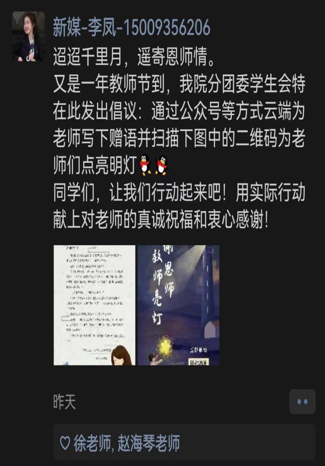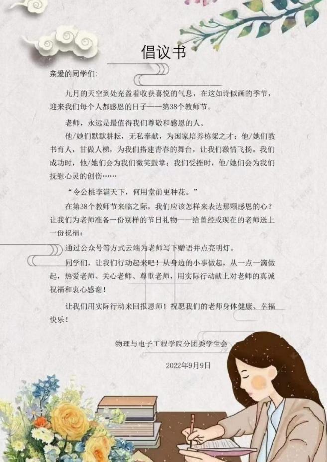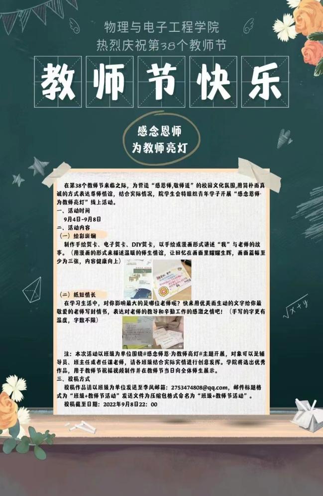 2022年9月10日是第38个教师节,在教师节来临之际,为营造“感恩师,敬师道”的校园文化氛围,beat365正版唯一官方网站分团委学生会于2022年9月4日至9月10日组织全院学生开展了“感念恩师·为教师亮灯”活动。