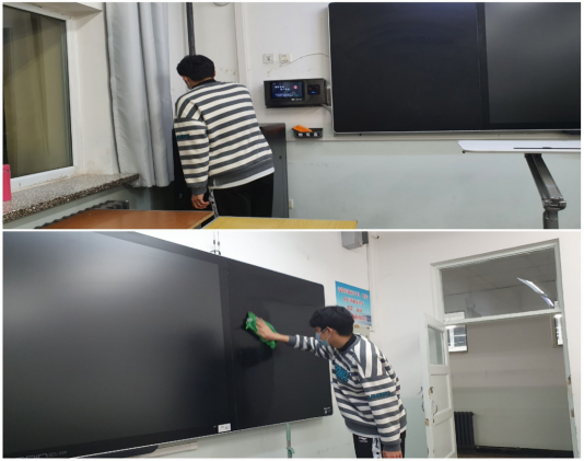 同学们认真擦拭多媒体设备、打扫工具摆放细节图