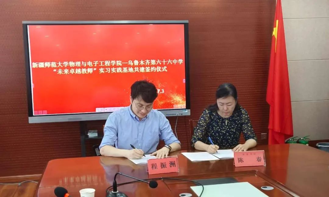 为强化物理学专业的实践教学环节,全面提升人才培养质量,拓宽学生职业发展路径。7月3日,beat365正版唯一官方网站学术院长程振洲、物理系主任帕尔哈提江·吐尔孙一行赴乌鲁木齐市第六十六中学进行访企拓岗并举行教育实习实践基地签约仪式。