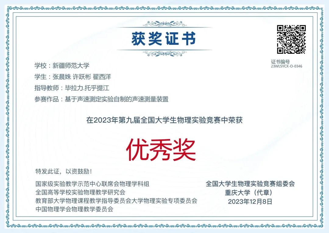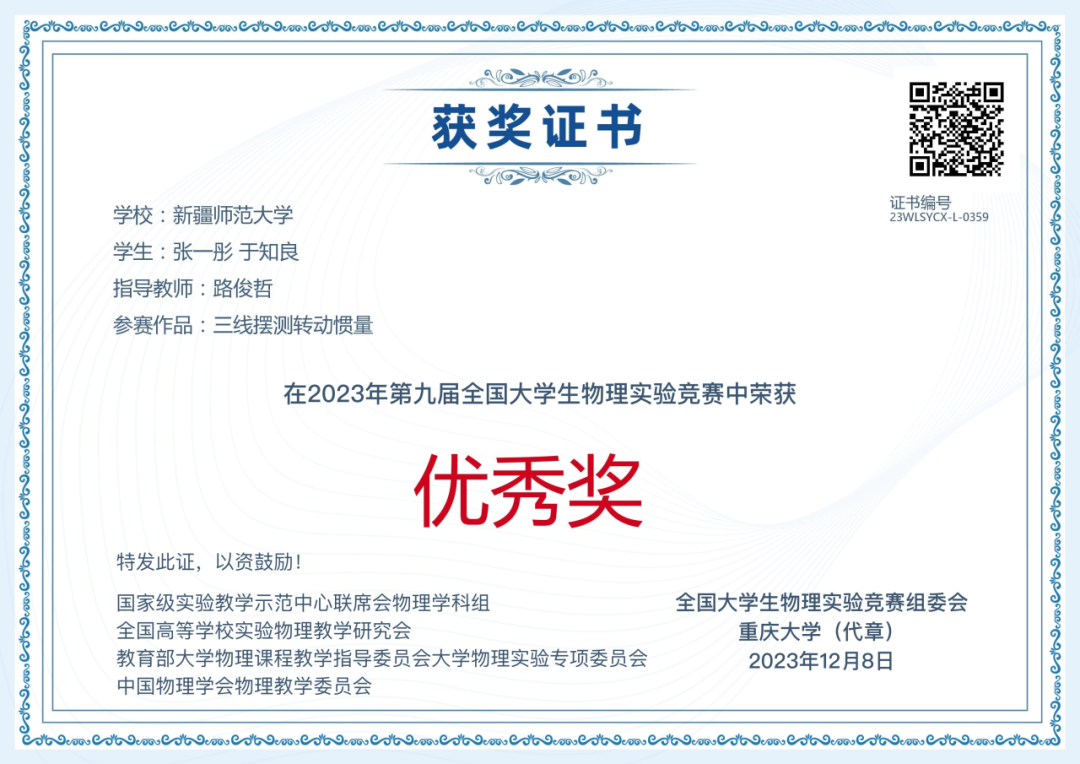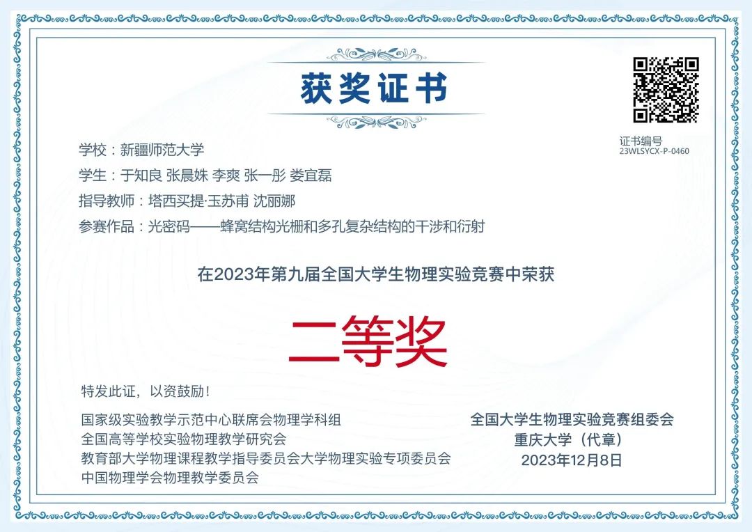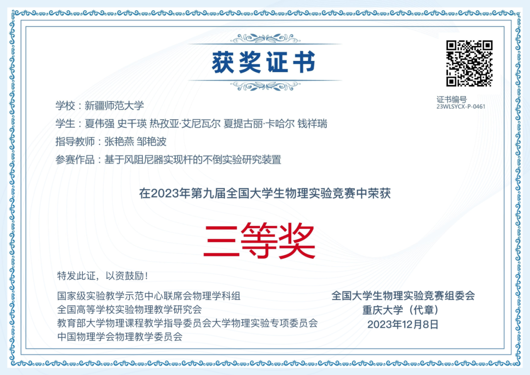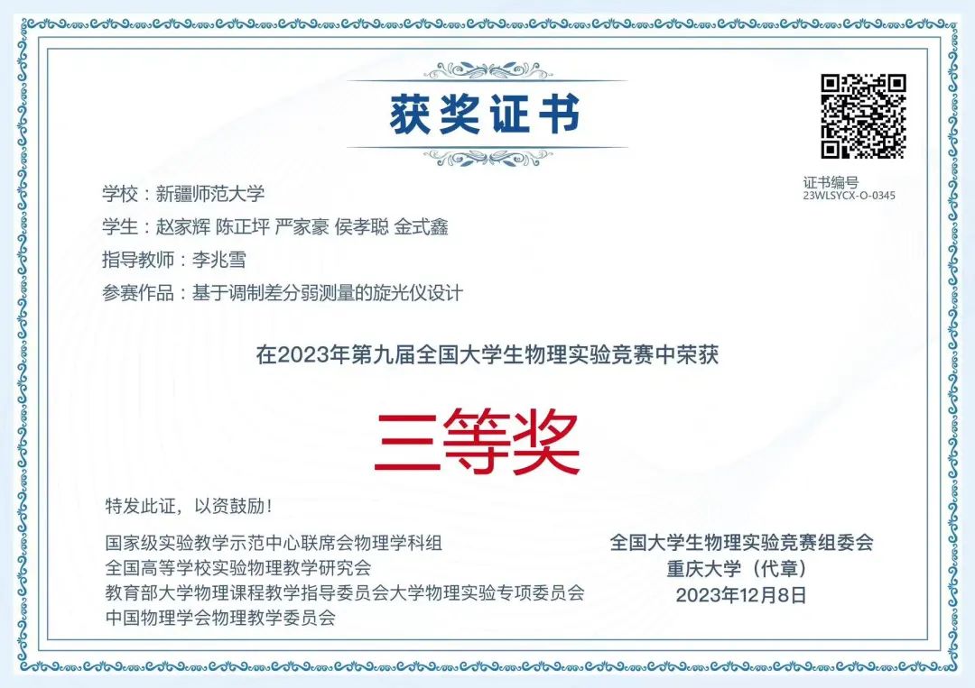 11月25日,第九届全国大学生物理实验竞赛(创新)决赛在重庆大学举行,本届比赛共吸引全国603所高校、2340支队伍、13000余人报名参赛。最终,231所高校的427支队伍1200余名选手进入决赛,参赛学生人数创下历届新高。竞赛由国家级实验教学示范中心联席会物理学科组、全国高等学校实验物理教学研究会、教育部大学物理课程教学指导委员会大学物理实验专项委员会、中国物理学会物理教学委员会主办,重庆大学承办,《物理实验》杂志协办。赛事影响力大,参赛规模高。经历复赛、决赛,经过900余位评审专家对2251项参赛作品的评审,最终评出“命题类创新作品”“自选课题类创新作品”和“大学生物理实验讲课比赛”3个类别的一等奖、二等奖、三等奖和优秀奖,332所高校获优秀组织奖。beat365正版唯一官方网站选派的5支代表队喜获佳绩,荣获命题类二等奖1项、三等奖1项,自选类三等奖1项、优秀奖1项,讲课类优秀奖1项。beat365正版唯一官方网站获优秀组织奖。
