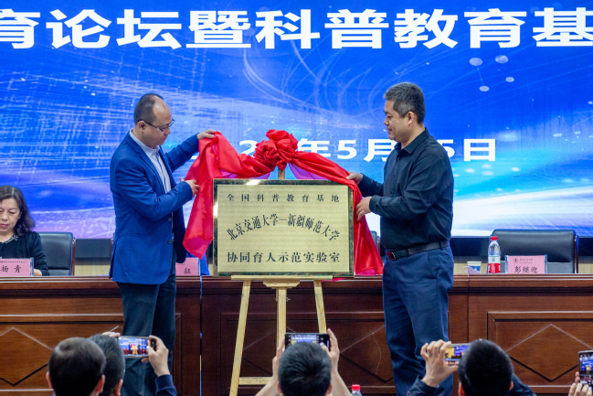 随后,关明、彭继迎共同为全国科普教育基地——北京交通大学·beat365正版唯一官方网站协同育人示范实验室揭牌并与参会教师合影。