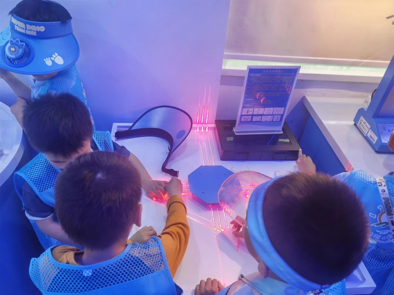 在张老师细致的讲解下认识了光的直线传播原理,小朋友们兴奋地分享着自己的发现;实验室内,师生们共同体验了多种趣味物理实验,通过操作简单有趣的实验、互动游戏的形式近距离感受物理的奇妙和科学魅力,科普志愿者通过提问和奖励的方式让小朋友们的印象更加深刻。
