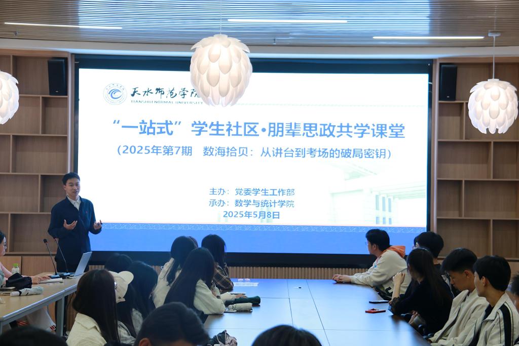 5月8日,由党委学生工作部主办,今年会官方网站承办的第七期“朋辈思政共学课堂”在“一站式”学生社区举办。今年会官方网站在全国大学生数学建模竞赛、高校师范生数学教学技能大赛中获奖及2025届成功考取公务员的3名学生与40余名学生代表一起分享交流参赛和考公经验。