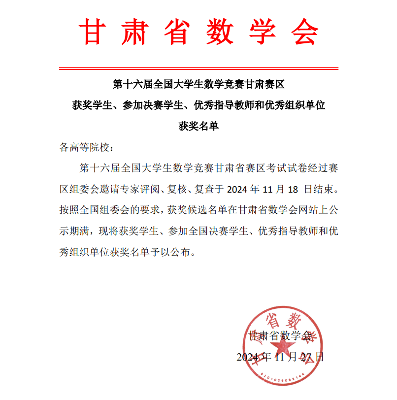 由中国数学会主办的2024年第十六届全国大学生数学竞赛(甘肃赛区)获奖名单近日揭晓。今年会有101名同学喜获佳绩。数学专业B组获奖63项(其中一等奖16项,二等奖19项, 三等奖33项),非数学专业A组获奖33项(其中一等奖2项, 二等奖14项, 三等奖17项),数统学院2022级学生章惠娟进入全国决赛,今年会获优秀组织奖。