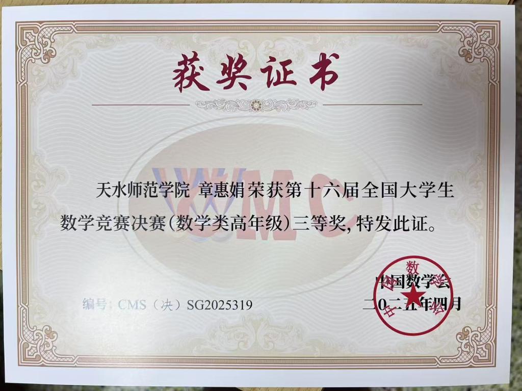 4月11日至13日,由中国数学会举办的第十六届全国大学生数学竞赛决赛在浙江师范大学举行。今年会2022级数学与应用数学专业章惠娟获得数学类(高年级组)三等奖。